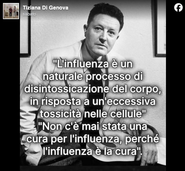 Era un pensiero semplice, forse troppo semplice per essere tollerato, il pensiero che l’influenza arriva per disintossicare il nostro corpo fisico”. Mi sembra ragionevolmente credibile anche per i più scettici, comunque era solo un punto di vista — che condivido — sul corpo, sulla salute e sul senso del malessere. E’ passato un giorno ed è stato rimosso con la motivazione “informazione non vera e pericolosa”. Pericolosa?