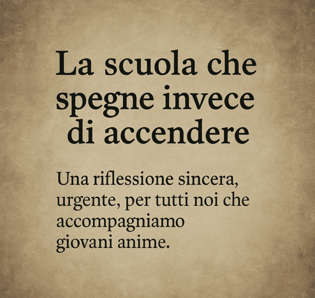 La scuola che spegne invece di accendere. Mi rivolgo a te, educatore, insegnante, maestro, a te che, forse da decenni, percorri corridoi e entri nelle aule, che distribuisci lezioni, assegni compiti e correggi errori; A te che credi di “aver insegnato” qualcosa semplicemente perché qualcuno ha studiato e ha preso buoni voti; a te che ti vanti dei “bravi alunni” e che, con la stessa leggerezza, liquidi gli “alunni incapaci” come se la loro fioritura, o la loro rinuncia a fiorire, non ti appartenesse minimamente.